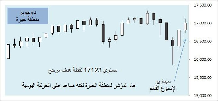بدأ داوجونز أسبوعه بعملية ارتداد وتعويض قوية؛ إذ وصلت ذروته إلى مستوى 16811 نقطة، وأغلق عند مستوى 16805 نقاط؛ وبالتالي عاد المؤشر لمنطقة الحيرة على مستوى الحركة الأسبوعية، لكنه صاعد على مستوى الحركة اليومية. ومهمة الأسبوع القادم ستكون ابتلاع النمط البيعي للأسبوع الأسبق، أي تجاوز مستوى 17145 نقطة، بعدها يمكن الحديث عن قمة تاريخية جديدة، تتجاوز مستوى 17350 نقطة، والعودة للمسار الصاعد.