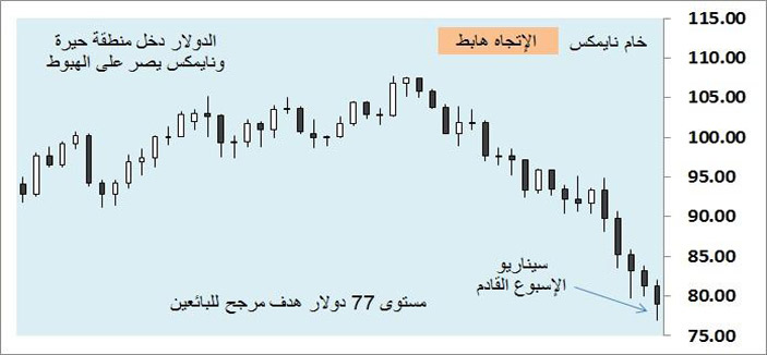 هبط الدولار إلى مستوى 84.5 أمام سلة عملاته، وارتد إلى مستوى 86؛ وبالتالي دخل في منطقة حيرة بعد هذا السلوك. ورغم هذا الهدوء إلا أن نايمكس أصر على الهبوط إلى 80 دولاراً والبقاء داخل المسار الهابط دون أي إشارات لعكس الاتجاه سوى الحفاظ على قاعه الأخير 79 دولاراً. ويرجح الأسبوع المقبل أن يسجَّل قاعٌ جديد لهذا الشهر عند مستوى 77 دولاراً، وكأن المتاجرين ينتظرون أسعار سبعينية أقل لخفض تكاليفهم في فصل الشتاء.