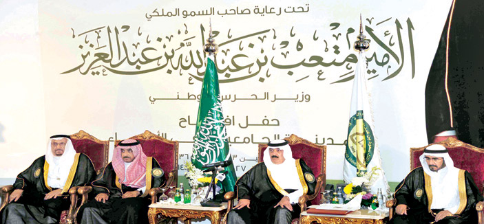 افتتح صاحب السمو الملكي الأمير متعب بن عبدالله بن عبدالعزيز وزير الحرس الوطني أمس المدينة الجامعية الجديدة لجامعة الملك سعود بن عبدالعزيز للعلوم الصحية بمحافظة الأحساء. وكان في استقبال سموه لدى وصوله مقر المدينة الجامعية صاحب السمو الملكي الأمير مشعل بن بدر بن سعود وكيل الحرس الوطني بالقطاع الشرقي وصاحب السمو الأمير بدر بن محمد بن جلوي محافظ الأحساء ومعالي المدير العام التنفيذي للشؤون الصحية بالحرس الوطني ومدير جامعة الملك سعود للعلوم الصحية الدكتور بندر بن عبدالمحسن القناوي ومعالي نائب وزير التعليم العالي الدكتور أحمد السيف. وفور وصول سموه مقر الحفل المقام بهذه المناسبة عزف السلام الملكي, ثم قام وكلاء الجامعة بالسلام على سموه, بعد ذلك بدئ الحفل الخطابي بالقرآن الكريم. بعدها ألقى معالي الدكتور القناوي كلمة أكد فيها فخره بتدشين هذا الصرح العلمي الفريد، برعاية سمو وزير الحرس الوطني في منطقة عزيزة على قلب كل محب لهذا الوطن الغالي, كما أكد أن كل منتسب إلى جامعة الملك سعود بن عبدالعزيز للعلوم الصحية والشؤون الصحية بوزارة الحرس الوطني يتشرف ويفاخر بإنجاز هذه المدينة الجامعية التي من غاياتها أن تخدم أبناء المنطقة الشرقية تحديداً والوطن بشكل عام. وأضاف إلى أن وجود سموكم بين أبنائكم وبناتكم من طلاب هذه الجامعة لهو تجسيد للمنهج الذي غرسه فينا قائد نهضتنا خادم الحرمين الشريفين الملك عبدالله بن عبدالعزيز آل سعود - حفظه الله - وتأكيد حرص قيادتنا الرشيدة على توفير كل ما من شأنه تحقيق النماء والتميز في الجانب العلمي والصحي والإنساني بشكل عام. وأكد معاليه أن المملكة تعيش الآن في أوج ازدهارها التنموي بفضل الدعم اللامحدود لقيادتنا الرشيدة، وكذلك تستشرف مستقبلاً واعداً وتترقب جيلاً وطنياً مؤهلاً وقادراً على النهوض والوصول بالوطن إلى مصاف الدول المتقدمة. بعد ذلك شاهد سمو وزير الحرس الوطني والحضور فلماً وثائقياً عن المدينة الجامعية بأقسامها وكلياتها المختلفة، والمرافق والخدمات التي تحتويها الجامعة التي تتربع على مساحه تقدر بـ 642 ألف متر مربع وتضم العديد من المنشآت الأكاديمية والإدارية كالمبنى الأكاديمي ومباني المرافق العامة والمنشآت الرياضية. ثم ألقى صاحب السمو الملكي الأمير متعب بن عبدالله بن عبدالعزيز وزير الحرس الوطني كلمة بارك فيها للجميع بالعام الهجري الجديد سائلا الله أن يجعلهام خير ورخاء على هذا الوطن العزيز شعبا وقيادة، مؤكداً سموه اعتزاز القيادة الرشيدة متمثلة في خادم الحرمين الشريفين الملك عبدالله بن عبدالعزيز آل سعود وسمو ولي عهده الأمين وسمو ولي ولي العهد - حفظهم الله - بهذه الجامعة الفتية وثقتهم الكبيرة في جميع منسوبيها لتحقيق غاياتها وأهدافها النبيلة، سائلاً الله عز وجل أن يبارك فيها ويجعلها منارة من منارات العلم تشع بالخير والعزة على هذا الوطن الغالي. وقال سمو الأمير متعب بن عبدالله بن عبدالعزيز: إن هذا اليوم المبارك في أحساء الجود والتاريخ نعيش جميعاً فرحة افتتاح المدينة الجامعية، لجامعة الملك سعود بن عبدالعزيز للعلوم الصحية بالأحساء الذي يأتي في إطار حرص وزارة الحرس الوطني على دعم البيئة الأكاديمية للتعليم العالي في المملكة, وتنفيذاً لتوجيهات خادم الحرمين الشريفين - أيده الله -، بإنشاء جامعة الملك سعود بن عبدالعزيز للعلوم الصحية في كل من الرياض والأحساء وجدة لتقدم التعليم العالي المتخصص في هذا المجال الحيوي المهم، ولتحقيق رؤيته - حفظه الله - في إنشاء جامعة لصحة الوطن. وتابع سموه يقول: نشهد اليوم افتتاح المدينة الجامعية في الأحساء, هذا الصرح الطبي الأكاديمي المتخصص الذي يهدف إلى استمرار الاستثمار في أبناء وطننا الغالي وتوطين التخصصات الصحية بكفاءات من أبناء وبنات الوطن يتم تأهيلها بأعلى المستويات، ووفقاً لأعلى المعايير لتقديم الخدمات الصحية بهذه المنطقة العزيزة، ولتعزيز دور المدن الطبية التابعة لوزارة الحرس الوطني كمؤسسات صحية م