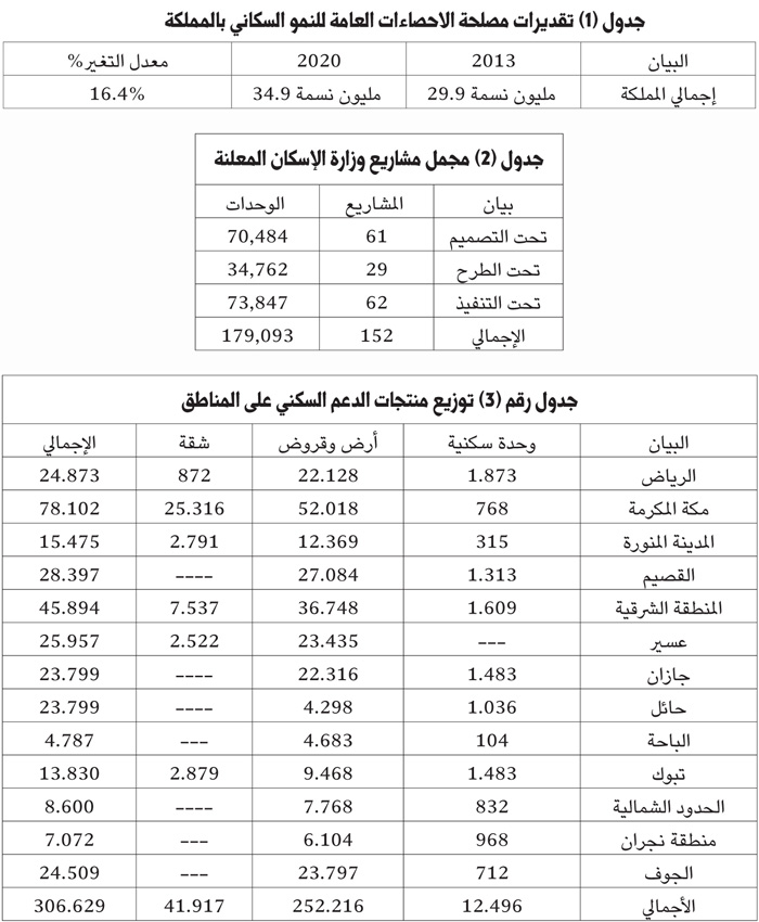 كما تشير الدراسات الحديثة إلى أن هناك طلبًا سنويًا على المساكن بالمملكة يعادل 250 ألف وحدة سكنية سنويًا، إضافة إلى أن حجم الطلب الإجمالي المتراكم المقدر توفيره في عام 2012م تقريبا كان يصل إلى حوالي مليون وحدة سكنية، أي أن عدد الوحدات السكنية المطلوبة الآن وفي نهاية عام 2014م سيصل إلى 1.25-1.5 مليون وحدة على أقل تقدير.