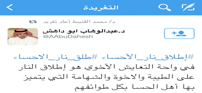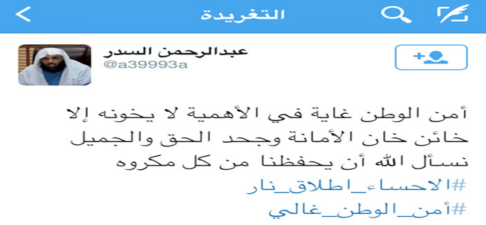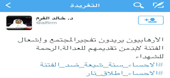 تفاعل مغرّدون على موقع التواصل الاجتماعي «تويتر» تضامناً مع ضحايا الاعتداء في محافظة الأحساء، الذي راح ضحيته خمسة مواطنين، وأُصيب تسعة آخرون.