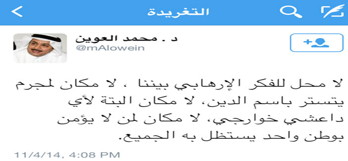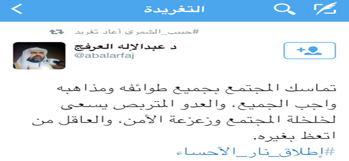 وقال المغرّد علي الجعفري: يجب أن نتكاتف جميعاً لمحاربة الطائفية، وأن من فعل هذا الاعتداء في الأشهر الحرام لا يمت للإسلام بصلة. أما الدكتور قيس المبارك فقال: قتل الأبرياء في قريتهم الآمنة جريمة مصادمة لديننا، وهي غدر لا يقدم عليه من يتقي الله. وغرد الدكتور عبدالوهاب أبو داهش قائلاً: في واحة التعايش الأخوي هو إطلاق النار على الطيبة والأخوة والشهامة التي تتميز بها الأحساء بكل طوائفها. فيما أشار الدكتور عبدالإله العرفج إلى تماسك المجتمع بجميع طوائفه ومذاهبه، وأن هذا واجب الجميع، وأن العدو المتربص يسعى لخلخلة المجتمع وزعزعة الأمن، والعاقل من اتعظ بغيره.