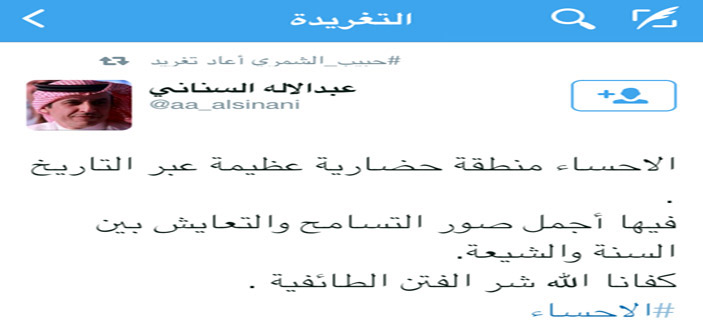 وجاءت التغريدات مناهضة وضد هذا الاعتداء, وأكد أصحابها أن ما تم في الأحساء يرفضه المنطق والدين والوطنية, باختلاف شرائح المجتمع، سواء مثقفين وأساتذة جامعات وكتّاباً ومواطنين عاديين، كلهم اتفقوا جميعاً على الإرهاب الذي تعرضت له محافظة الأحساء، وما نتج منه من خسائر بشرية وإصابات ومادية، مؤكدين نبذ الطائفية.