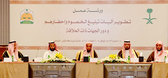 وناقش المشاركون في ورشة عمل تطوير آليات تبليغ الخصوم وإحضارهم ودور الجهات ذات العلاقة مانص عليه نظامي المرافعات الشرعية والإجراءات الجزائية و القرارات القضائية في نظامي المرافعات والتنفيذ ودور الجهات الحكومية من الإمارات في المناطق المختلفة بالمملكة ومؤسسة النقد العربي السعودي والمؤسسة العامة للبريد السعودي والقطاعات العسكرية بكافة قطاعاتها في تبليغ الخصوم وإنفاذ ما جاء في الأنظمة القضائية بتبليغ الخصوم وإحضارهم .