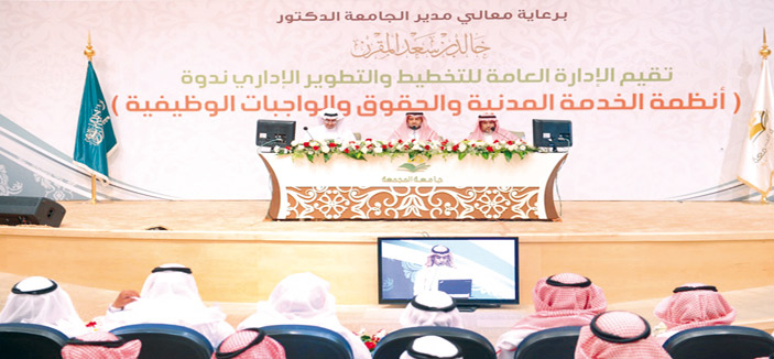 بحضور مدير جامعة المجمعة الدكتور خالد بن سعد المقرن نظمت الإدارة العامة للتخطيط والتطوير الإداري ندوةً بعنوان (أنظمة الخدمة المدنية والحقوق والواجبات الوظيفية ) وتهدف هذه الندوة إلى تعزيز الجانب التوعوي للموظفين فيما يتعلق بالحقوق والواجبات الوظيفية، وقد قدم الندوةَ الأستاذ صالح بن عبدالعزيز الشميمري مدير عام المراجعة الداخلية والاستفسارات الوظيفية بوزارة الخدمة المدنية والأستاذ عبدالله بن صالح الدهامي مدير عام الترقيات بوزارة الخدمة المدنية؛ حيث تطرقا إلى أهم أنظمة الخدمة المدنية المتعلقة بالموظفين وحقوقهم وواجباتهم الوظيفية، وقد ألقى الدكتور سعد بن ذعار القحطاني كلمةً في بداية الندوة رحب فيها بالحضور، وأكد أن الندوة تتعلق بجهود الجامعة ودعم قياداتها للارتقاء بأداء جميع منسوبيها ودعم كافة حقوقهم الوظيفية بما يحقق الرضا الوظيفي في إطار رؤية ورسالة وأهداف الجامعة.