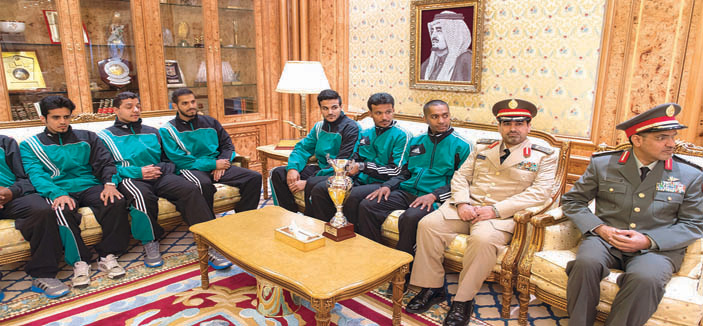 استقبل صاحب السمو الملكي الأمير سلمان بن عبدالعزيز آل سعود ولي العهد نائب رئيس مجلس الوزراء وزير الدفاع في مكتبه بالرياض أمس معالي رئيس هيئة الأركان العامة الفريق أول ركن عبدالرحمن بن صالح البنيان ورئيس هيئة عمليات القوات المسلحة اللواء ركن محمد عبدالخالق الغامدي ومدير إدارة الشؤون الرياضية للقوات المسلحة العميد ركن يحيى هياس الزهراني وأعضاء منتخب القوات المسلحة الحاصل على المركز الثاني في البطولة العربية العسكرية الخامسة للتايكوندو في الأردن.