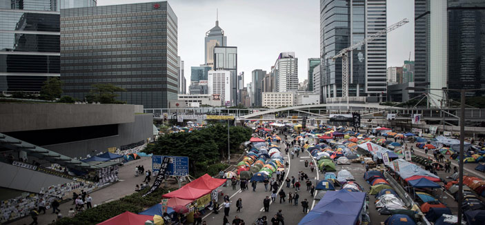 وتناقصت تلك الاعداد بشكل كبير لكن مجموعة في قلب المتظاهرين معظمهم من الطلاب يواصلون الضغط على السلطات في هونج كونج التي تصف ايضا الاحتجاجات بأنها غير قانونية.