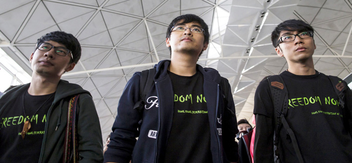 وبعد إبلاغهم برفض السماح لهم بالسفر، طوق مؤيديون القادة الثلاثة وفتحوا المظلات الصفراء التي تشكل رمز حركة الشباب في هونغ كونغ. وقد رفعوا لافتة كتب عليها «نريد انتخابات حقيقية».