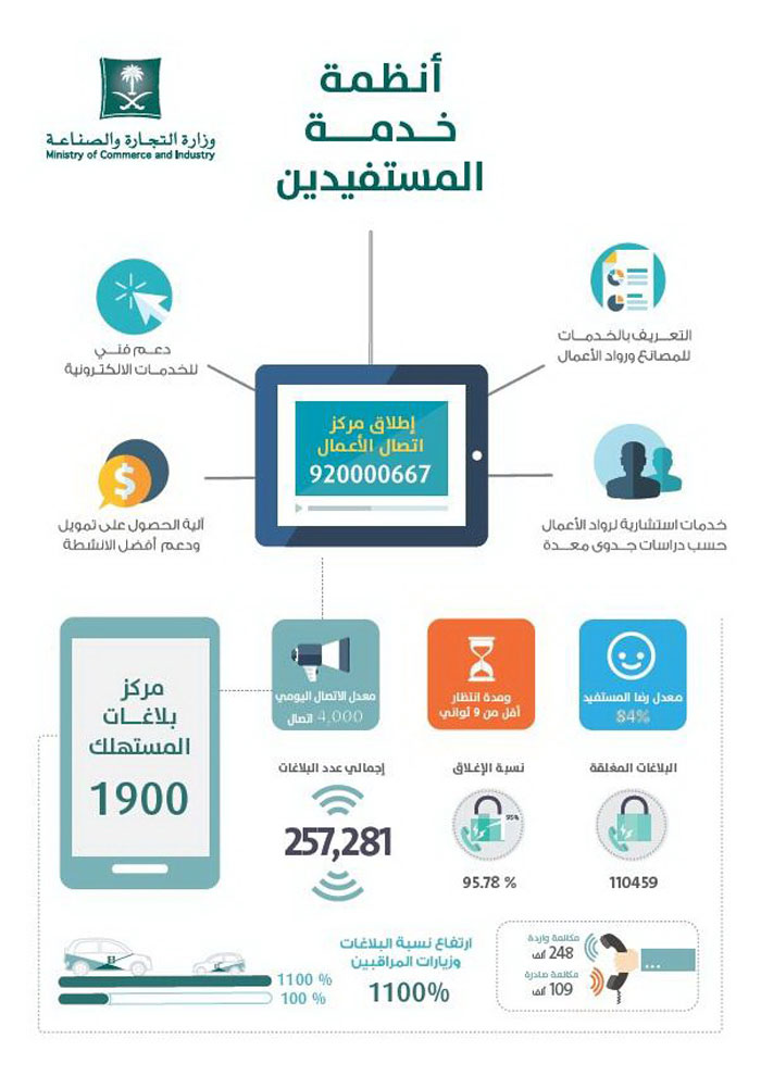 وتستقبل أنظمة خدمة المستفيدين ما يقارب 4000 اتصال يومياً يتم التجاوب معها جميعاً وبمعدل انتظار لا يتجاوز 9 ثوان، ويتم من خلال مركز بلاغات المستهلك (1900) استقبال البلاغات عن المخالفات ومتابعتها آلياً بالتواصل مع المراقبين ومباشرتهم المخالفة باستخدام الاجهزة الذكية التي ساعدت في سرعة الانجاز، ويستقبل مركز البلاغات ما يقارب 2200 اتصال يوميا على مدار الساعة ، وتجاوزت نسبة اغلاق البلاغات 97% كما تجاوز معدل رضا عملاء المركز 86% ، كما يستقبل مركز اتصال الأعمال ما يقارب 1800 اتصال يوميا بمعدل انتظار لا يتجاوز 9 ثوان.