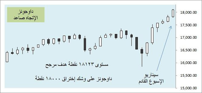 سجل مؤشر الداوجونز قمة تاريخية جديدة عند مستوى 17894 نقطة، وأنهى الأسبوع على نمط شرائي متوسط القوة، مما جعله يبتعد عن منطقة الحيرة، ويكمل مساره الصاعد الذي بدأ من مستوى 15855 نقطة والتداول الذي كان عند منطقة 17500 نقطة كان قاعاً صاعداً، لذا من الممكن أن يخترق الحاجز 18000 نقطة ويشيد قمة عند 18123 نقطة، وهذا مدعوم بإيجابية المؤشرات الاقتصادية الأمريكية وتفوق الدولار على معظم العملات الأجنبية.