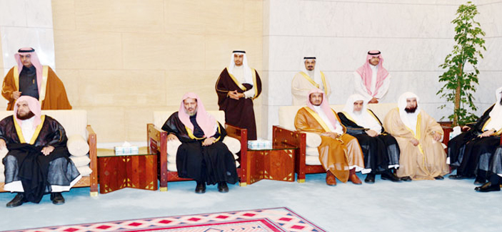 وفي بداية الاستقبال ألقى سموه كلمةً، رحب فيها بالحضور, منوهاً بما توليه حكومة خادم الحرمين الشريفين الملك عبدالله بن عبدالعزيز آل سعود وسمو ولي عهده الأمين وسمو ولي ولي العهد - حفظهم الله - من دعم واهتمام لتجسيد الصورة الصحيحة للعدالة الشرعية في بلادنا، التي تأسست على تحكيم الشريعة الإسلامية، مستشهداً سموه بمشروع خادم الحرمين الشريفين لتطوير مرفق القضاء، وقفزاته النوعية في التطوير وإعطاء الصورة الذهنية الصحيحة.