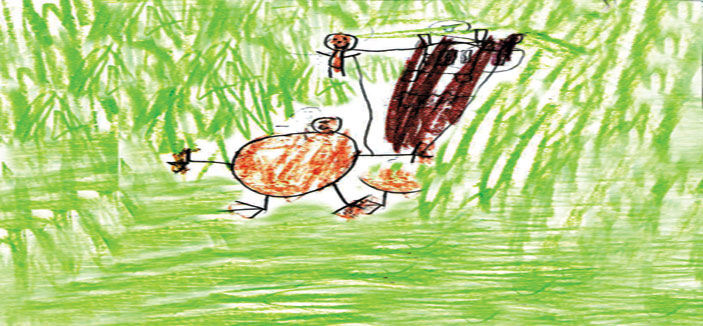 حملت الأربع دجاجات والمغزل المكسور على الحمار ثم جلست على السرج وفي طريقهما في الغابة كانت الأم راكبة والابن يسير في أثرها يستحث الحمار يسرع.