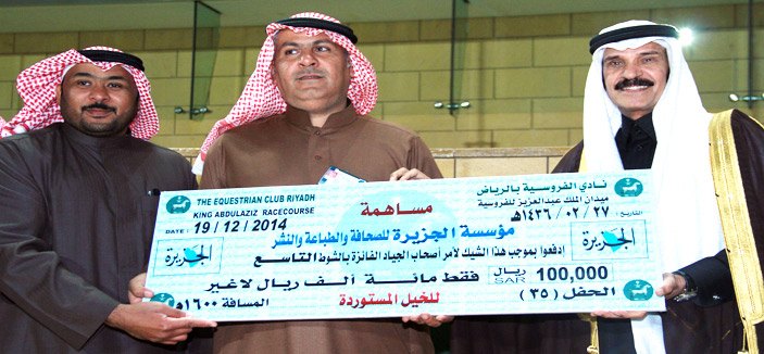 شهد ميدان الملك عبد العزيز بالجنادرية مساء أمس كرنفالية مؤسسة الجزيرة للصحافة والطباعة والنشر وسط حضور جماهيري تابع الأشواط الـ 10 في أمسية الجمعة وحتى مسك ختامها الذي كان على الشوطين الرئيسين، ومساهمة مؤسسة الجزيرة في الشوط التاسع الذي كسبه الجواد اوسس دانسر والعايد لإسطبلات علياء الحجاز، فيما كسب سيارة الجزيرة الحصان ضبح لسلطان اليحيى.. وعقب نهاية الشوطين توج رئيس التحرير الأستاذ خالد المالك ملاك الجوادين الفائزين.