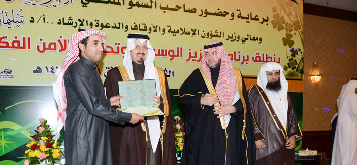 تلا ذلك عرض مرئي احتوى عدد من كلمات وخطب العلماء والدعاة حول مسألة الوسطية والأمن الفكري.. وفي نهاية الندوة سلم سمو أمير عسير عدداً من الدروع وشهادات الشكر لعدد من منسوبي فرع الوزارة وكذلك الجهات الإعلامية الراعية للندوة وتسلم سموه هدية تذكارية بهذه المناسبة. من جهة أخرى استقبل صاحب السمو الملكي الأمير فيصل بن خالد بن عبدالعزيز بمكتبه بالإمارة أمس وكيل وزارة الشئون الإسلامية والأوقاف والدعوة والإرشاد لشئون المساجد الدكتور توفيق بن عبدالعزيز السديري يرافقه مدير عام فرع الوزارة بمنطقة عسير الشيخ الدكتور حجر بن سالم العماري والذي قدم للسلام على سموه وتسليمه عدداً من مؤلفاته.