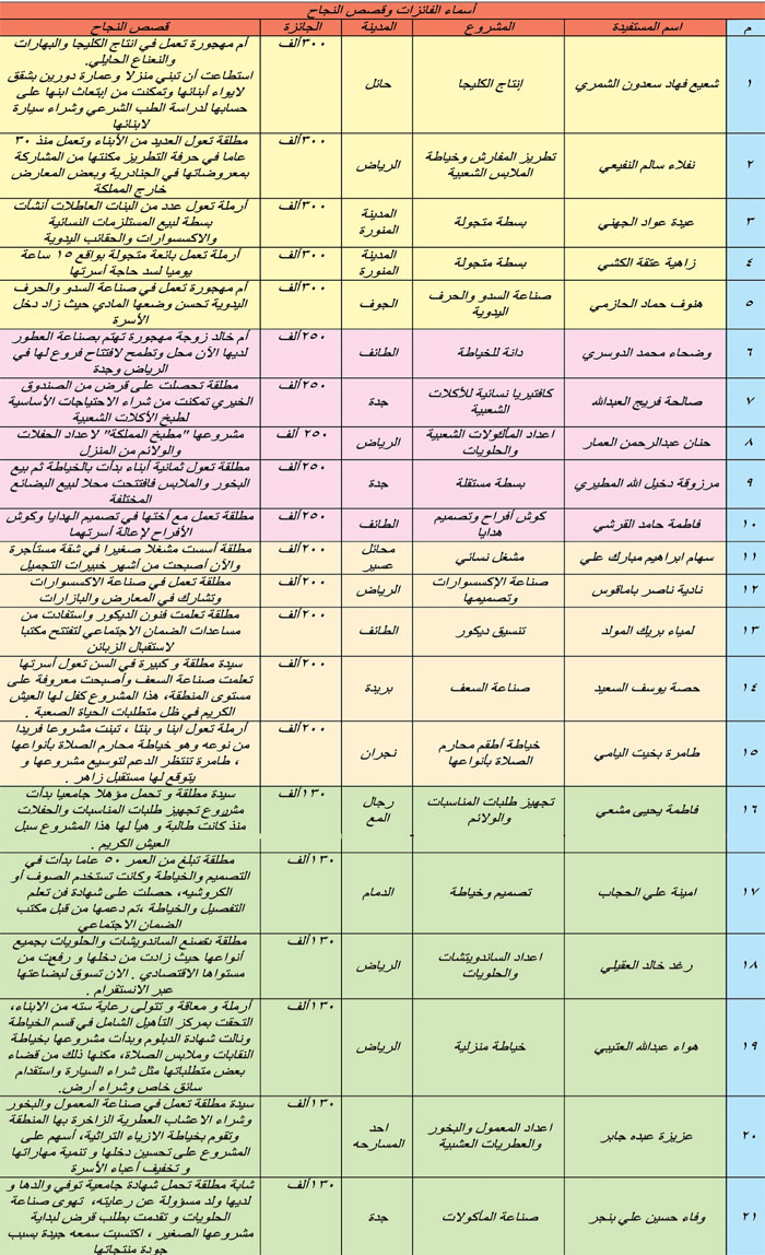 الفئة الثانية: سوق قطرة للأسر المنتجة، الذي تقدمه جمعية عنيزة النسائية الخيرية (قطرة)، ومبادرة دعم الأسر المحتاجة وتقدمها السيدة نجاح الوراق الحجيلان، ومبادرة طمأنينة، والتي تقدمها جمعية البر الخيرية في الجوف، وبرنامج التدريب والتوظيف، المقدم من جمعية طيبة النسائية للتنمية الاجتماعية، وحصل كل فائز على مبلغ مالي قدره (500) ألف ريال.