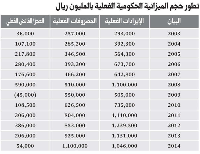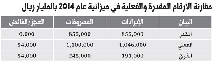 أنهت ميزانية المملكة عام 2014م بنفقات حكومية قياسية بقيمة 1100 مليار ريال .. فبالرغم من أن هذا العام كان مليئا بالمستجدات السياسية والاقتصادية الإقليمية والعالمية، فقد استمر الاقتصاد السعودي في مفاجأة العالم كله بالاستمرار للعام الثالث على التوالي في تحقيق أقوى ميزانياته الفعلية على الإطلاق، بأعلى مصروفات حكومية بـ1100 مليار ريال. وبقيمة إيرادات بلغت 1046 مليار ريال.. متقبلا حدوث عجز بقيمة ضئيلة بقيمة 54 مليار ريال، أو ما يعادل نسبة 4.9% من إجمالي المصروفات. وعليه من الواضح أن الحكومة توجهت للاستمرار في تكملة مشروعاتها الوطنية العملاقة التي بدأتها في بداية العام 2014م حتى رغم اكتشاف التراجع في الأسعار العالمية للنفط خلال الشهور القليلة الأخيرة.