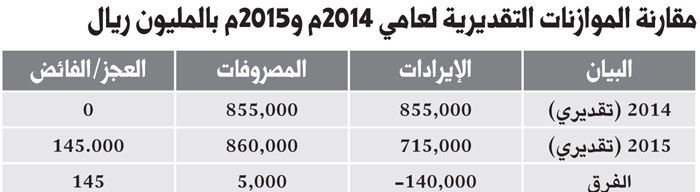 على الرغم أن تراجع أسعار النفط حدث لفترة ليست طويلة خلال 2014م، ورغم أن هذا التراجع قائم على ركود اقتصادي في غالبية الاقتصادات الصناعية الكبرى، ورغم أن التوقعات تحوم حول عدم استمرار التراجع لفترات طويلة، وحتى إن استمر فلا يتوقع أن ينحدر عن مستوى الـ70 دولارا للبرميل خلال 2015م (وهذا يعتبر من التقديرات المتشائمة) إلا أن صانع القرار الرسمي بالمملكة يبدو أنه يستمر في منهجه المتحفظ في تقديرات أسعار النفط ومن ثم تقديراته للإيرادات النفطية، وعليها تقديراته للإيرادات الحكومية التي تراجعت تقديراته لها كثيرا لتبلغ 715 مليار ريال.. وتقدر وحدة الأبحاث والتقارير بالجزيرة تقديرات الحكومة لأسعار النفط بأنها تتراوح ما بين 55 دولاراً إلى 60 دولاراً للبرميل.