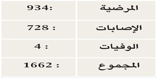 باشرت هيئة الهلال الأحمر السعودي «1662» حالة بجميع مناطق المملكة يوم الاثنين الماضي، وسجلت الحالات المرضية أكثر من «934» حالة، فيما بلغت الإصابات «728» حالة وبلغت الوفيات أربع حالات.