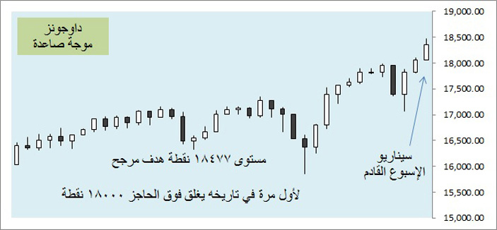 بدأ مؤشر الداوجونز اسبوعه بهبوط إلى مستوى 17812 نقطة ثم عكس اتجاهه بشكل مباغت وقلص خسائره تماما مثل سلوكه الاسبوع ما قبل الماضي، ولأول مرة يغلق فوق الحاجز النفسي 18000 نقطة حيث أغلق عند مستوى 18053 نقطة وبنمط شرائي قوي ويبدو أن شهية المخاطرة ارتفعت بعد تحسن أهم مؤشرين وهما الناتج المحلي بنموه ومعدل البطالة بتراجعه والهدف المرجح القادم قريب من مستوى 18477 نقطة.