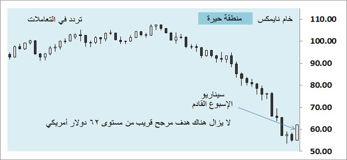 تذبذب خام نايمكس ما بين 58 دولارا و 55 دولارا بنمط متوازن تسيطر عليه الحيرة على مستوى الحركة الاسبوعية ولا يزال المسار هابطا على مستوى الحركة الشهرية ومما ساهم في هذه الحيرة هو الخوف من تخطي العملة الخضراء مستوى 90 أمام سلة عملاته وهو ما نتوقعه، ويرجح الاسبوع المقبل أن يواصل نايمكس صعوده إلى مستوى 62 دولارا ويغلق عنده عبر نمط شرائي خصوصا مع بدء اشتداد فصل الشتاء في أمريكا وأوروبا.