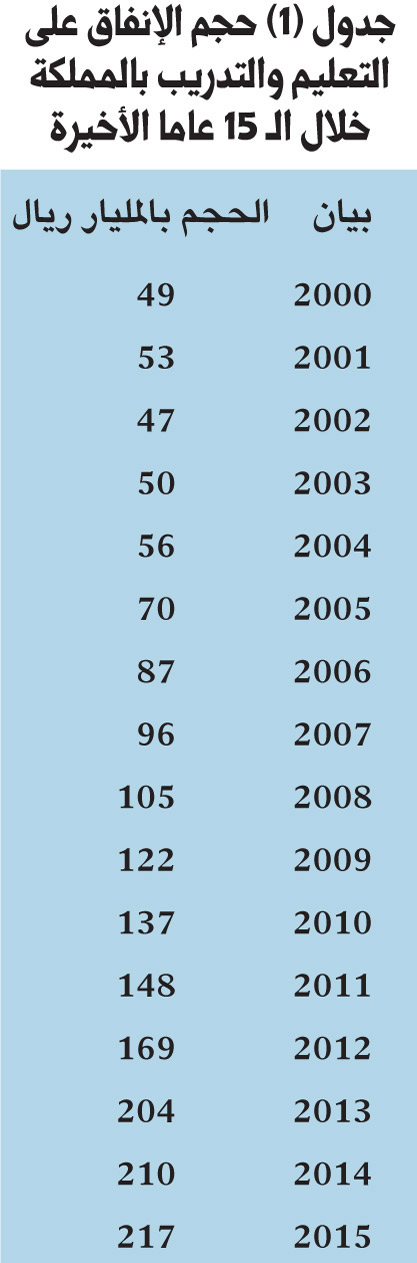 إلا إن المملكة العربية السعودية تعتبر من الدول القليلة التي تأخذ منحى الدول المتقدمة في الانفاق على التعليم، حيث وصل هذا المعدل للإنفاق على التعليم إلى ما يناهز 7.7% من الناتج المحلي الإجمالي في موازنة 2015م، بقيمة وصلت إلى 217 مليار ريال من إجمالي قيمة ناتج محلي إجمالي بالأسعار الجارية بلغ 2822 مليار ريال .. بل إن نسبة الانفاق على التعليم والتدريب بالمملكة لم تقل منذ ثلاث سنوات عن مستوى 200 مليار ريال .. فضلا عن مجمل الانفاق على التعليم بالمملكة وصل خلال السنوات العشر الأخيرة ما يناهز 1496 مليار ريال، وهي قيمة تفوق ميزانيات عدد من الدول العربية وجنوب الصحراء مجتمعة ليس للتعليم فقط ولكن ميزانيات الدول ككل.