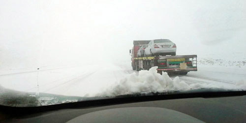 وقد أدى غزارة الثلج وارتفاع منسوبه إلى وقوع حادث انقلاب لشاحنة قرب الحماد.
