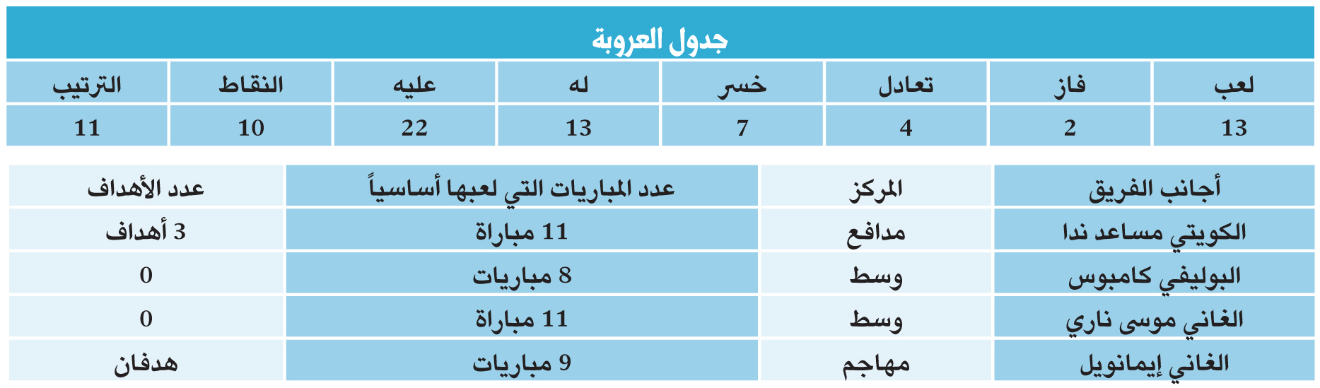 تواصل الجزيرة مناقشتها لمستويات فرق دوري عبداللطيف جميل. واليوم نقف مع صاحب المركز الحادي عشر «فريق العروبة»، الذي لعب ثلاث عشرة مباراة، جمع من خلالها عشر نقاط، بعد أن فاز في مباراتين، وخسر أربعاً، وتعادل في سبع.