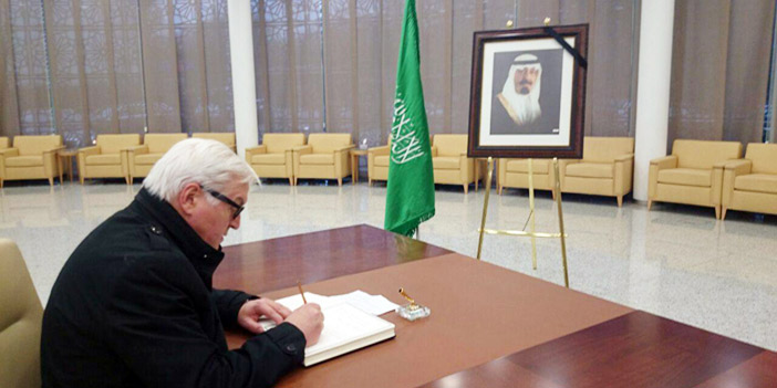 وتقدم معالي وزير الخارجية الألماني فرانك فالتر شتاينماير المعزين «الألمان» ودون في سجل زيارات التعزية كلمات عبر فيها عن بالغ حزنه العميق بوفاة الملك عبدالله بن عبدالعزيز - رحمه الله - مبينا أنه ونيابة عن رئيس جمهورية ألمانيا ومستشارته والشعب الألماني يشاطرون المملكة حزنها على القائد الكبير وملك الإنسانية.
