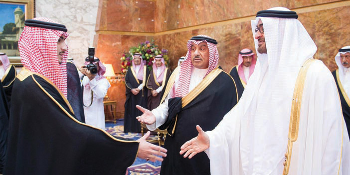بعد ذلك صافح صاحب السمو الشيخ محمد بن زايد آل نهيان مستقبليه، صاحب السمو الملكي الأمير خالد بن بندر بن عبدالعزيز مستشار خادم الحرمين الشريفين، وصاحب السمو الملكي الأمير منصور بن متعب بن عبدالعزيز وزير الدولة عضو مجلس الوزراء مستشار خادم الحرمين الشريفين، وصاحب السمو الملكي الأمير متعب بن عبدالله بن عبدالعزيز وزير الحرس الوطني، وصاحب السمو الأمير الدكتور مشعل بن عبدالله بن مساعد مستشار خادم الحرمين الشريفين، وصاحب السمو الملكي الأمير عبدالعزيز بن سلمان بن عبدالعزيز نائب وزير البترول والثروة المعدنية، وصاحب السمو الملكي الأمير الدكتور عبدالعزيز بن سطام بن عبدالعزيز مستشار خادم الحرمين الشريفين، وصاحب السمو الملكي الأمير منصور بن مقرن بن عبدالعزيز المستشار بديوان سمو ولي العهد، وصاحب السمو الملكي الأمير محمد بن سلمان بن عبدالعزيز وزير الدفاع رئيس الديوان الملكي المستشار الخاص لخادم الحرمين الشريفين، وأصحاب المعالي الوزراء وكبار المسؤولين من مدنيين وعسكريين، وأعضاء السفارة الإماراتية بالرياض.