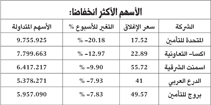 بلغت قيمة تداولات السوق الأسبوع الماضي 47.6 مليار ريال نفذت هذه القيمة المتداولة من خلال تدوير 1.7 مليار سهم وقد تم تداول هذه الأسهم من خلال تنفيذ 787.4 ألف صفقة تمت خلال الأسبوع الماضي, كان متوسط حجم كمية الأسهم المتداولة في السوق خلال الجلسات الخمسة الماضية 337.5 مليون سهم يوميا, استحوذت أربعة قطاعات على 60 % من تداولات الأسبوع الماضي وكان القطاع البنكي أكثر القطاعات نشاطا حيث استحوذ على 17.4 % من إجمالي التداولات إذ بلغت القيمة المتداوله في القطاع البنكي 8.2 مليار ريال تلاه القطاع العقاري الذي استحوذ على 15.7 % من إجمالي القيمة المتداولة في السوق وكان القطاع العقاري تداول ما قيمته 7.4 مليار ريال وجاء ثالثا قطاع التأمين الذي استحوذ على 13.7 % من إجمالي القيمة المتداول حيث بلغت القيم المتداولة في القطاع 6.5 مليار ريال, ويأتي قطاع البتروكيماويات كآخر القطاعات النشطة في السوق حيث استحوذ على 11.9 % من إجمالي القيمة المتداولة في السوق وكانت قيمة التداولات في القطاع 5.6 مليار ريال. بنهاية تداولات الأسبوع الماضي كانت القيمة السوقية لسوق الأسهم السعودية قد بلغت 1.9 تريليون ريال سعودي ما يعادل 505.1 مليار دولار أمريكي وعند هذا المستوى يكون السوق المالي السعودي يتداول عند مكرر ربحية يبلغ 17 مضاعفا وبمعدل عائد على التوزيعات النقدية يبلغ 3.7 % ويمثل هذا العائد من التوزيعات المستوى الوسطي لمعدل التوزيعات النقدية للسنوات الخمس الأخيرة.