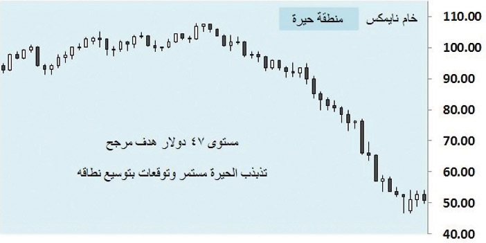 تذبذب خام نايمكس بين 54 دولاراً و49 دولاراً بشكل وسع من نطاق الحيرة على مستوى الحركة الأسبوعية، وأنهى الأسبوع على نمط بيعي، ويرجح أن يهبط ليختبر مستوى 47 دولاراً. لكن بشكل عام، هذه الحيرة إيجابية، وقد تكون قاعاً لموجة صاعدة على المدى المتوسط، أي بضعة أسابيع قادمة، وخصوصاً أن العملة الخضراء تواجه مشاكل فنية فوق الحاجز 90 أمام سلة عملاتها، وهذا الترهل يخدم الحركة السعرية لخام نايمكس صعوداً.