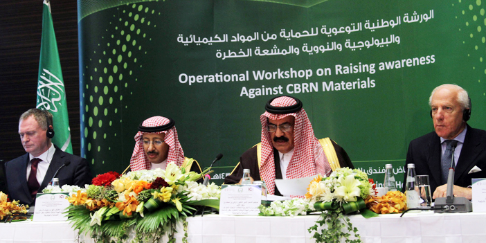 من جانب آخر بين سموه في كلمة له في افتتاحية الورشة التي شاركت فيها عدة جهات حكومية مدنية وعسكرية وخبراء من خارج المملكة.. بأن هذه الندوة هي الأولى من نوعها التي تعقد لرفع مستوى تأهيل الكوادر السعودية المتخصصة في هذه المجالات، واطلاعهم على أحدث الأساليب المتبعة دولياً للوقاية من هذه المواد وحماية المواطنين من مخاطرها، ناقلاً لهم تحيات وتمنيات صاحب السمو الملكي الأمير / سعود الفيصل وزير الخارجية، والذي يتم عقد هذه الورشة بدعم ومتابعة مباشرين من سموه.