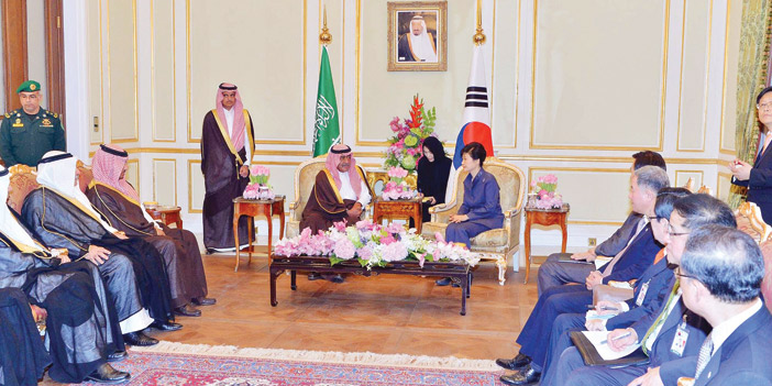 التقى صاحب السمو الملكي الأمير مقرن بن عبد العزيز آل سعود ولي العهد نائب رئيس مجلس الوزراء - حفظه الله - مساء أمس فخامة الرئيسة بارك كون هي رئيسة جمهورية كوريا وذلك في مقر إقامتها بقصر الملك سعود للضيافة بالرياض. ورحب سمو ولي العهد في بداية اللقاء بفخامتها، متمنيّاً لها ولمرافقيها طيب الإقامة في المملكة.