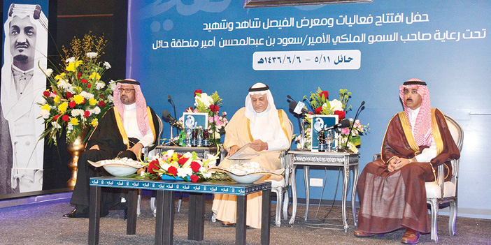 ثم بعد ذلك تجول سمو أمير منطقة حائل وبرفقته سمو الأمير تركي الفيصل وعدد من المسؤولين والمثقفين في المعرض، وقدم الأمير تركي الفيصل شرحاً مفصلاً عما احتواه المعرض من صور فوتوغرافية نادرة للملك الفيصل ومشاهد متحركة، ولقطات مرئية سجلت مراحل متعددة في مسيرة الملك الراحل، إضافة إلى بعض المقتنيات الخاصة، وعدد من المخطوطات والنصوص المكتوبة. وقد بدأ الحفل بآيات من الذكر الحكيم، ثم كلمة لمعالي مدير الجامعة الدكتور خليل بن إبراهيم الخليل، رحب فيها بصاحب السمو الملكي الأمير سعود بن عبدالمحسن أمير منطقة حائل، وبصاحب السمو الملكي الأمير تركي بن فيصل بن عبدالعزيز، وبصاحب السمو الملكي الأمير فيصل بن سعود بن عبدالمحسن، وبالحضور من مسؤولين من الجهات الحكومية والمثقفين والأدباء بالمنطقة.