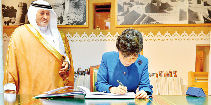 وفي نهاية الجولة سجلت كلمة في السجل الذهبي للمتحف، عبرت فيها عن سعادتها بزيارة المتحف الوطني وقالت» إنه يمثل علامة مضيئة تحكي تاريخ المملكة والحضارات المتعاقبة على أرضها، مبدية إعجابها بمقتنياته ومعروضاته». كما زارت فخامة رئيسة جمهورية كوريا قصر المصمك التاريخي بالرياض, حيث استقبلها الدكتور علي الغبان، ومدير المتحف ناصر العريفي . وتجولت داخل القصر واطلعت على ما يحتويه من معروضات تاريخية، وصور ومعلومات وخرائط تبرز تاريخ المملكة ومراحل تأسيسها. واستمعت إلى شرح عن أهمية حصن المصمك وما قام به المؤسس الملك عبدالعزيز ـ رحمه الله ـ, من كفاح في توحيد المملكة العربية السعودية، وجهود الهيئة العامة للسياحة والآثار في العناية والحفاظ على التراث والآثار بالمملكة. وأبدت فخامة الرئيسة الكورية في كلمة سجلتها في سجل الزوار إعجابها بقصر المصمك التاريخي وما تقوم به الهيئة العامة للسياحة والآثار من أعمال تطويرية للمتاحف .