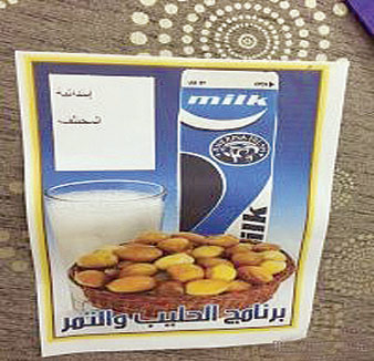 وتم توزيع نشرات ومطويات تتحدث عن أهمية وفوائد تناول الحليب والتمور.