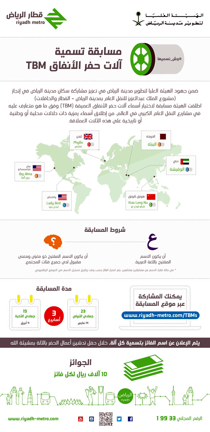 تطلق هيئة تطوير منطقة الرياض اليوم مسابقة لاختيار أسماء آلات حفر الأنفاق العملاقة TBM، والتي جرى تصنيعها في كبرى المصانع العالمية خصيصاً للمشروع، وجارٍ نقلها وتركيبها في مواقع العمل تمهيداً لإطلاق أعمالها في الحفر في القريب العاجل بمشية الله.