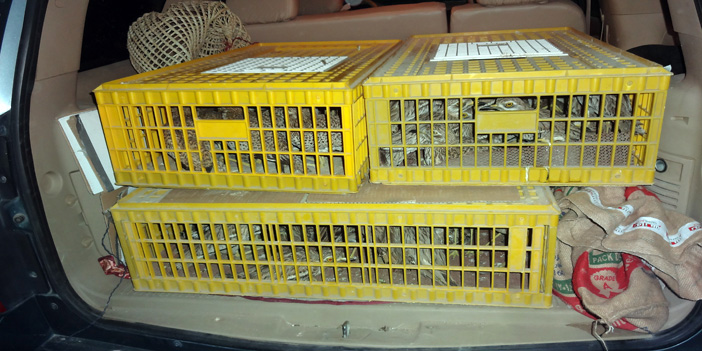وأوضح مدير عام الجمرك الأستاذ عيد العنزي قائلاً: قدمت للجمرك مركبة من نوع «خصوصي»، وذلك بقصد المغادرة إلى خارج المملكة وعند إنهاء إجراءاتها الجمركية المعتادة عُثر على عدد (5) حيوانات من نوع «رتم» وهو من فصيلة القطط البرية, بالإضافة إلى عدد (16) أرنباً, و(72) طيراً من نوع «الكروان» كانت جميعها مخبأة أسفل المراتب الخلفية للمركبة بعد أن تم تغطيتها لغرض الإخفاء وتهريبها إلى خارج المملكة.. وأضاف العنزي: أنه جرى بعد ذلك اتخاذ الإجراءات اللازمة وتم تسليم حيوانات «الرتم» إلى الهيئة الوطنية للحياة الفطرية.