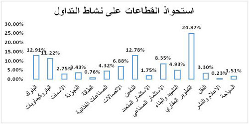 واستمر القطاع العقاري في الاستحواذ على أعلى قيم التداول، بعد أن تداول ما يزيد عن 12,3مليار ريال مستحوذا على 24.87% من إجمالي القيمة المتداولة في السوق، وجاء القطاع البنكي السعودي كثاني القطاعات استحواذا على نشاط التداول، حيث بلغت القيمة المتدوالة في القطاع 6,4 مليار ريال ما تمثل 12.9%، فيما جاء التأمين كثالث القطاعات نشاطا باستحواذه على 12.78% من إجمالي القيمة المتداولة، بعد أن تجاوزت القيمة المتداولة في القطاع 6,3 مليار ريال.