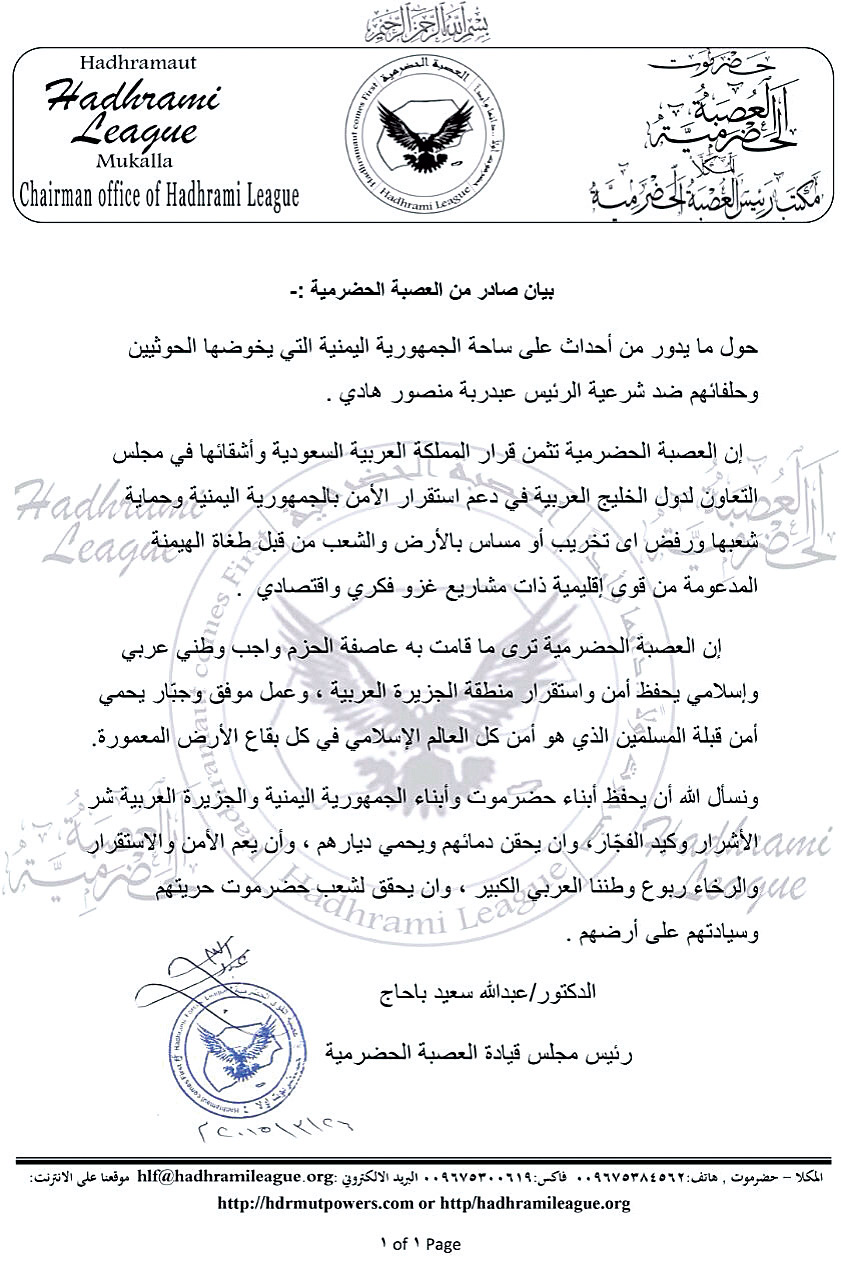 إلى ذلك تلقت الجزيرة بيان العصبة الحضرمية المؤيد لعاصفة الحزم والموقع من الدكتورعبدالله سعيد با حاج رئيس مجلس قيادة العصبة الحضرمية حيث ثمن البيان ما تقوم به العاصفة بقيادة المملكة العربية السعودية من ضرب على أيدي البغاة الظالمين مما يسهم في عودة الأمن والاستقرار إلى ربوع اليمن معتبرين الأمر واجباً دينياً ووطنياً عربياً يحمي أمن واستقرار اليمن والجزيرة العربية مقر قبلة المسلمين مؤكدين وقوف العصبة الحضرمية بالدم وبكل ما تملك مع الحلف حتى يحقق أهدافه المباركة.