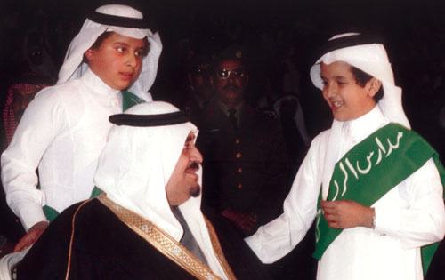 الملك فهد بن عبدالعزيز يتحدث إلى نجله الأمير عبدالعزيز بن فهد ويقف خلفهما الأمير فيصل بن خالد بن سلطان أثناء احتفالات مدارس الرياض