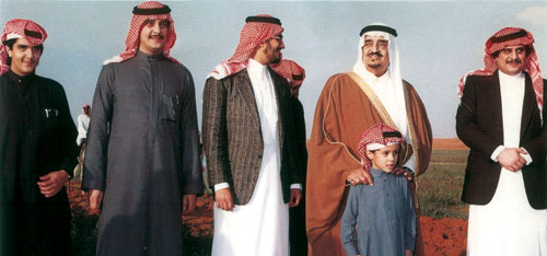 من اليمين: الأمير سلطان بن فهد بن عبدالعزيز، خادم الحرمين الشريفين الملك فهد بن عبدالعزيز، الأمير سعود بن فهد بن عبدالعزيز، الأمير خالد بن فهد بن عبدالعزيز، والأمير عبدالعزيز بن فهد بن عبدالعزيز، وخلفهم الأمير فيصل بن تركي بن عبدالله، بينما يقف في الأمام الأمير عبدالعزيز بن سعود بن فهد، في المخيم الملكي خارج مدينة الرياض