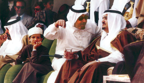 الأمير فهد بن عبدالعزيز ولي العهد نائب رئيس مجلس الوزراء وإلى جانبه الأمير بدر بن عبدالعزيز نائب رئيس الحرس الوطني والأمير عبدالعزيز بن فهد بن عبدالعزيز في الحفل السادس لسباق الهجن بالجنادرية في الرياض
