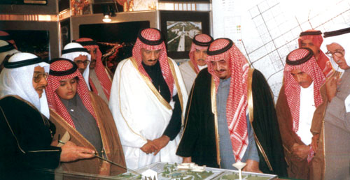 الملك فهد بن عبدالعزيز يستعرض مجسمات مشروعات مدينة الرياض، وإلى جانبه الأمير سلمان بن عبدالعزيز أمير منطقة الرياض ورئيس الهيئة العليا لتطوير مدينة الرياض، والأمير عبدالعزيز بن فهد بن عبدالعزيز، ومعالي الأستاذ محمد أبا الخيل وزير المالية والاقتصاد الوطني، ومعالي الأستاذ إبراهيم العنقري وزير الشؤون البلدية والقروية، ومعالي الأستاذ حسين منصوري وزير المواصلات، ومعالي الأستاذ عبدالله النعيم أمين مدينة الرياض، والدكتور ناصر السلوم وكيل وزارة المواصلات