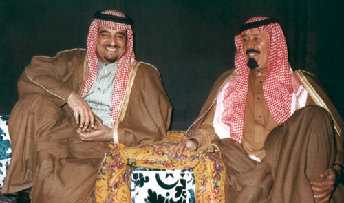 الأمير عبدالله بن عبدالعزيز النائب الثاني لرئيس مجلس الوزراء ورئيس الحرس الوطني والأمير فهد بن عبدالعزيز ولي العهد نائب رئيس مجلس الوزراء في المخيم الملكي بروضة الخفس خارج مدينة الرياض