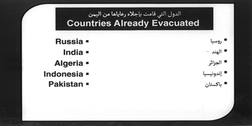 ولفت المتحدث الانتباه إلى عدم صحة ما تناقلته وكالات الأنباء أمس من تعطيل مهمات الصليب الأحمر، مؤكِّداً أن رحلاتهم مجدولة اليوم ولا يوجد أي تعطيل، وانه كان هناك تغيير من قبل الصليب الأحمر بطريقة إيصال الشحنات، وتغيير للمواقع والجهات التي سترد منها الطائرات. وأوضح المتحدث باسم قوات التحالف المستشار في مكتب سمو وزير الدفاع العميد ركن أحمد بن حسن عسيري أنه تم إجلاء رعايا عدد من الدول منذ بدء العمليات وهم رعايا دول روسيا والهند والجزائر وإندونيسيا وباكستان ، فيما لا تزال هناك رحلات مجدولة اليوم وغداً لدول ومنظمات غير حكومية وهم « اليونيسف والصين وجيبوتي ومصر والسودان «، وسيقدم الصليب الأحمر طائرتي إغاثة سوف توجه إلى اليمن ، وتم تحديد وقت وصول رحلاتهم ، أما الدول التي لها طلبات تحت الإجراء فهي إما لأنهم لم يحددوا جهة قدوم الطائرة من أين ستأتي أو لم يحدد موعد وصولها وهم « الأمم المتحدة وألمانيا والاتحاد الأوروبي وباكستان وكندا الأردن والعراق «، مبيناً أن بعض الدول العربية ترغب أن يكون الإجلاء عن طريق البر إلى مطار جازان ثم يتم إجلائهم إلى دولهم أو طلب أن يَتمَّ إجلاؤهم إلى جيزان ثم الدولة تحدد الوسيلة المناسبة لنقلهم إلى دولهم ، مطالباً الدول والمنظمات غير الحكومية بأن تحترم وتلتزم بالوقت الذي حددته لهم قوات التحالف لكي تضمن أن تتم عملية الإجلاء تحت ظروف آمنة. وأشار العميد أحمد عسيري أنه تم مساء أمس الاتصال بالصليب الأحمر وأكدوا أنه تم تحديد الرحلة والوقت ، مبيناً أن قوات التحالف ما وجدت إلا لخدمة ونجدة المواطن اليمني، منوهاً على الدول التي ستخلي رعاياهم أن تحترم الوقت المحدد لهذه العملية لتكون بشكل منظم وتصب في مصلحة الإخوة في اليمن ، مؤكِّداً أن هذه العملية مهمة ومن واجبات التحالف ومن أساسيات الخطة المعمولة.