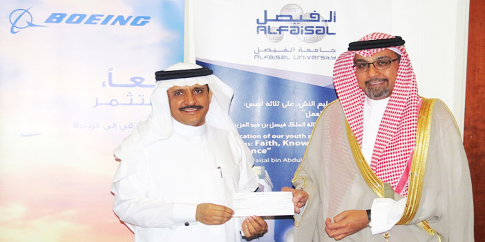 قدمت شركة بوينج في المملكة العربية السعودية لجامعة الفيصل شيكا بمبلغ وقدره 375,000 ألف ريال سعودي لدعم وتطوير إنجازات الطلبة البحثية.