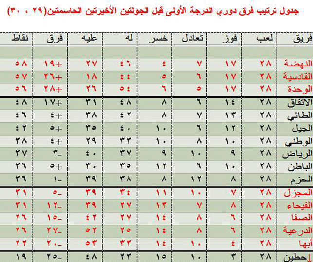 ضمن لقاءات الجولة التاسعة والعشرين من دوري الأولى تقام مساء اليوم الجمعة مباريات الجولة الثماني التي ربما تكتب نهاية أحداث طويلة قبل الختام بجولة واحدة، وربما نتعرف اليوم على هوية الصاعدين من الفرق الثلاثة المتنافسة النهضة والقادسية والوحدة، وكذلك ربما نتعرف على هوية الناجين من الهبوط الذي يحاصر أكثر من فريق وكذلك ربما تكتب هذه الجولة هوية الهابط الثاني بجانب حطين، وستكون المباريات على النحو التالي: