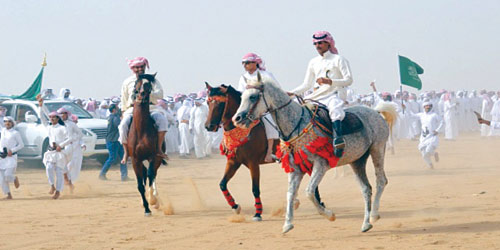 وأقبلت قبائل يام كعادتها المعروفة عنها بالزامل الترحيبي النجراني، الذي يصطف فيه الرجال صفاً واحداً، وينشدون بلحن معين بيتين من الشعر تعبر عن ما يريدون قوله أو إيصاله، يتقدمهم الشيخ أبو ساق وكبار السن وأعيان القبائل، تستعرض أمامهم الخيول العربية الأصيلة حاملين راية التوحيد عاليا وكانت كلمات الزامل كالتالي :