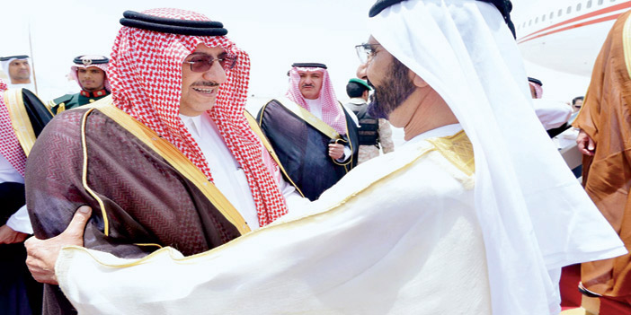كما وصل صاحب السمو الشيخ محمد بن راشد آل مكتوم نائب رئيس دولة الإمارات العربية المتحدة رئيس مجلس الوزراء حاكم دبي، وكان في استقباله بمطار قاعدة الرياض الجوية أخوه خادم الحرمين الشريفين الملك سلمان بن عبدالعزيز آل سعود، الذي رحب به وبمرافقيه في المملكة العربية السعودية. كما كان في استقباله صاحب السمو الملكي الأمير فيصل بن بندر بن عبدالعزيز أمير منطقة الرياض، وصاحب السمو الملكي الأمير محمد بن نايف بن عبدالعزيز ولي العهد نائب رئيس مجلس الوزراء وزير الداخلية، ومعالي وزير الثقافة والإعلام الدكتور عادل بن زيد الطريفي الوزير المرافق، ومعالي الأمين العام لمجلس التعاون لدول الخليج العربية الدكتور عبداللطيف بن راشد الزياني, ومعالي رئيس المراسم الملكية الأستاذ خالد بن صالح العباد، ومعالي أمين منطقة الرياض المهندس إبراهيم بن محمد السلطان، وسفير دولة الإمارات لدى السعودية محمد سعيد الظاهري. بعد ذلك صافح سمو الشيخ محمد بن راشد آل مكتوم مستقبليه، صاحب السمو الملكي الأمير خالد بن بندر بن عبدالعزيز مستشار خادم الحرمين الشريفين، وصاحب السمو الملكي الأمير الدكتور منصور بن متعب بن عبدالعزيز وزير الدولة عضو مجلس الوزراء مستشار خادم الحرمين الشريفين، وصاحب السمو الملكي الأمير متعب بن عبدالله بن عبدالعزيز وزير الحرس الوطني، وصاحب السمو الأمير الدكتور مشعل بن عبدالله بن مساعد مستشار خادم الحرمين الشريفين، وصاحب السمو الملكي الأمير عبدالعزيز بن سلمان بن عبدالعزيز نائب وزير البترول والثروة المعدنية، وصاحب السمو الملكي الأمير منصور بن مقرن بن عبدالعزيز مستشار خادم الحرمين الشريفين، ومعالي رئيس مجلس الشورى، وأصحاب المعالي الوزراء وكبار المسؤولين من مدنيين وعسكريين. وبعد استراحة قصيرة في صالة التشريفات غادر السمو الشيخ محمد بن راشد آل مكتوم في موكب رسمي إلى قصر الدرعية. ويضم الوفد الرسمي المرافق لسمو نائب رئيس دولة الإمارات سمو الشيخ الفريق سيف بن زايد آل نهيان نائب رئيس مجلس الوزراء وزير الداخلية، وسمو الشيخ طحنون بن زايد آل نهيان نائب مستشار الأمن الوطني، وسمو الشيخ عبدالله بن زايد آل نهيان وزير الخارجية، ومعالي وزير شؤون مجلس الوزراء محمد بن عبدالله القرقاوي، ومعالي وزير الدولة للشؤون الخارجية الدكتور أنور محمد قرقاش، والمدير العام لدائرة التشريفات والضيافة بدبي خليفة سعيد سليمان، وسفير دولالإمارات لدى المملكة محمد سعيد الظاهري.